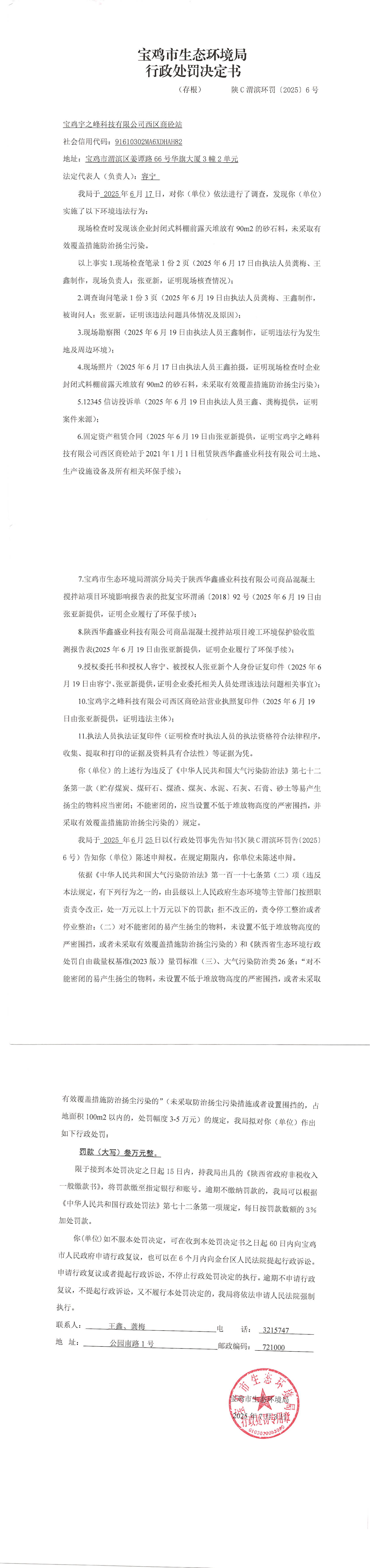 十大网赌平台排行榜行政处罚决定书(陕C渭滨环罚〔2025〕6号)