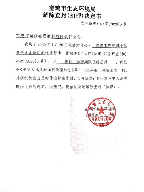 网赌平台解除查封(扣押)决定书 (宝环解查(扣)字〔2020〕5号)