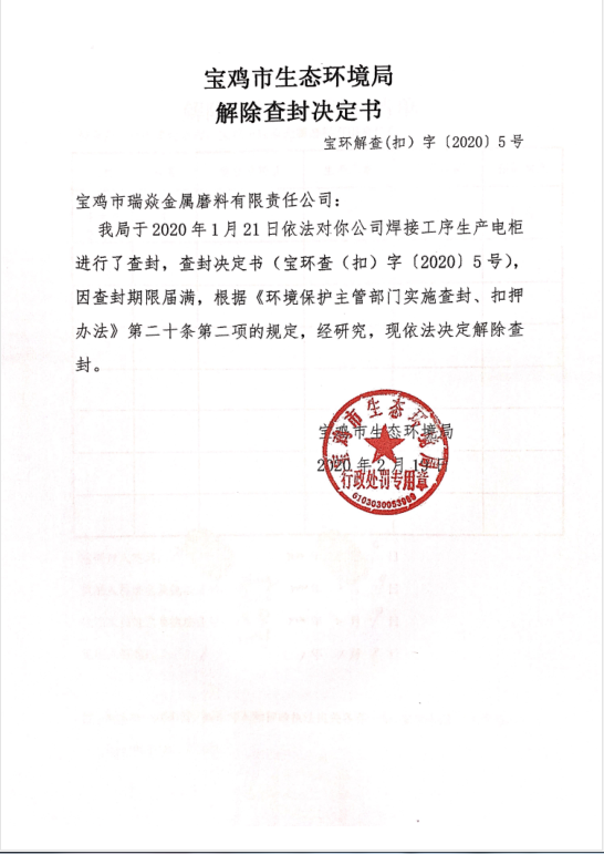 十大网赌平台排行榜解除查封决定书 宝环解查(扣)字【2020】5号