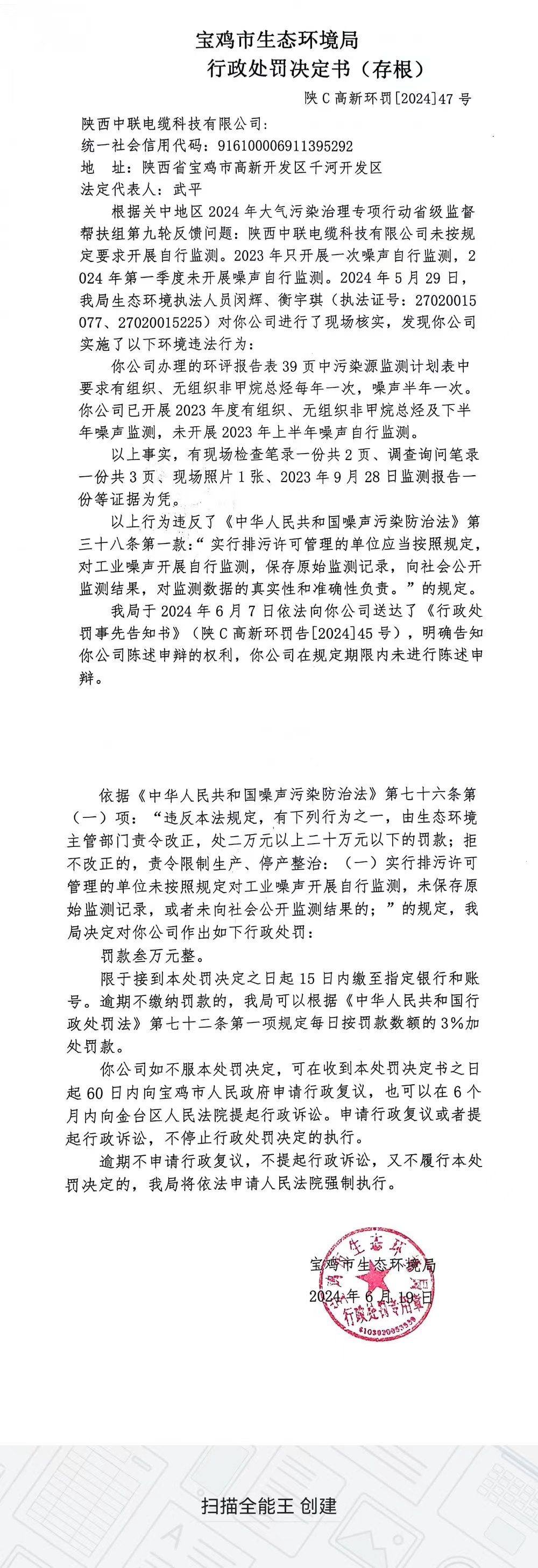 网赌平台行政处罚决定书(陕C高新环罚[2024]47号)