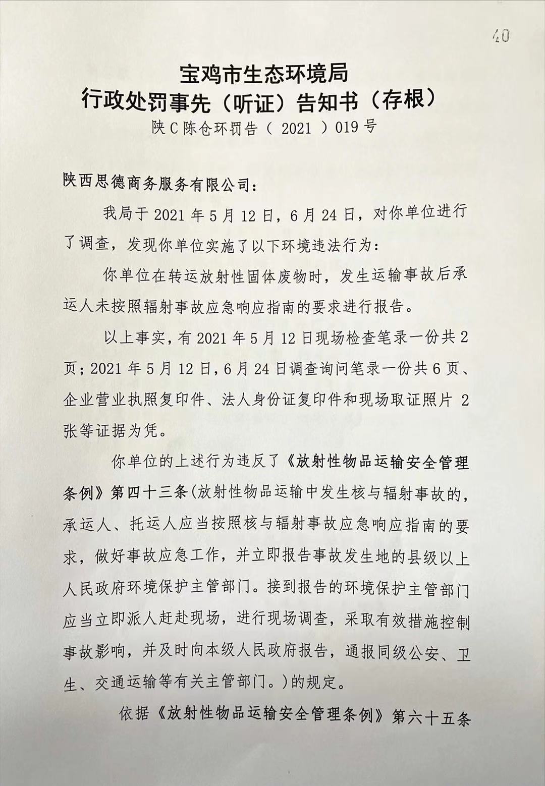 十大网赌平台排行榜 行政处罚事先告知书(存根) 陕C陈仓环罚告( 2021 )19号