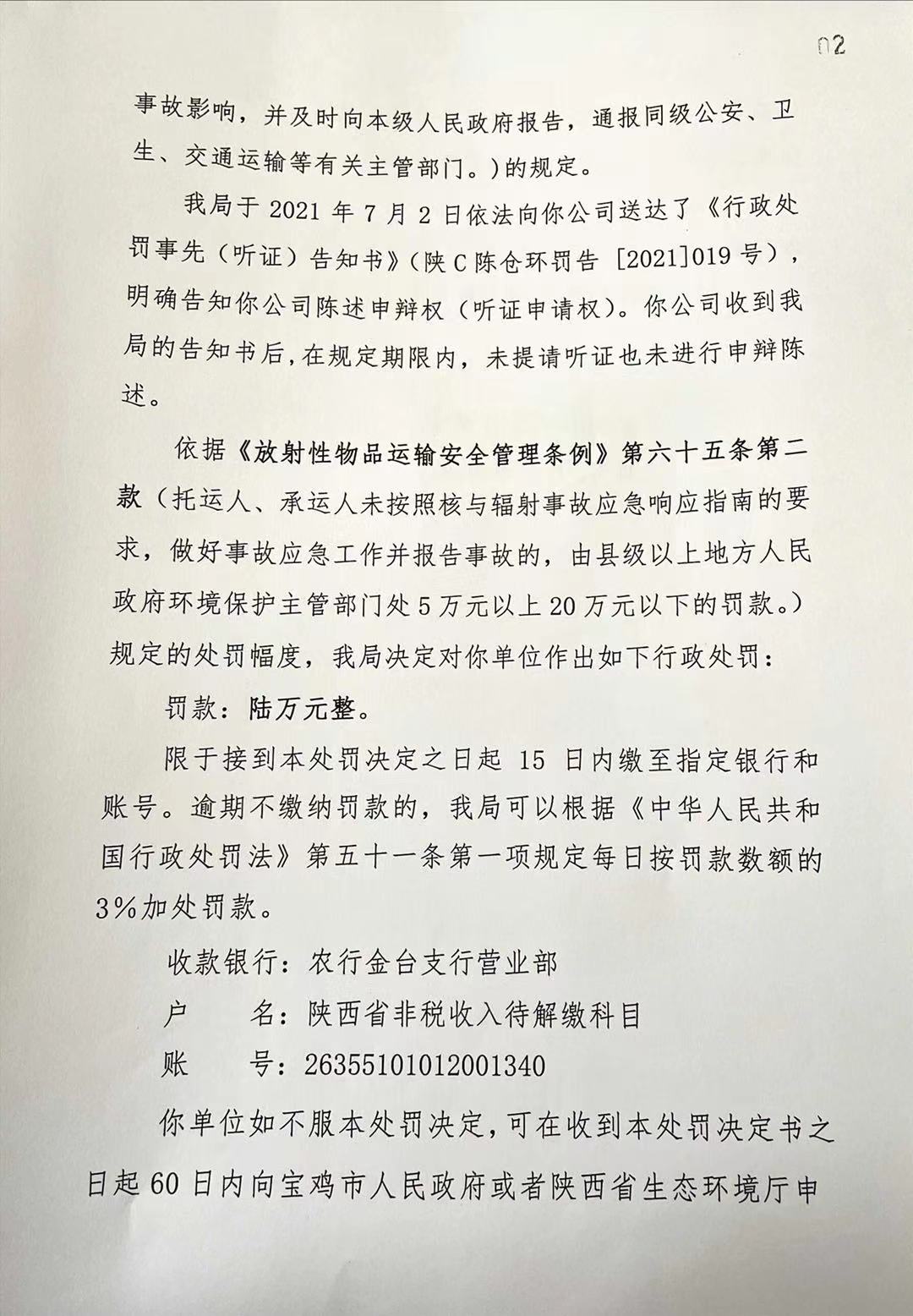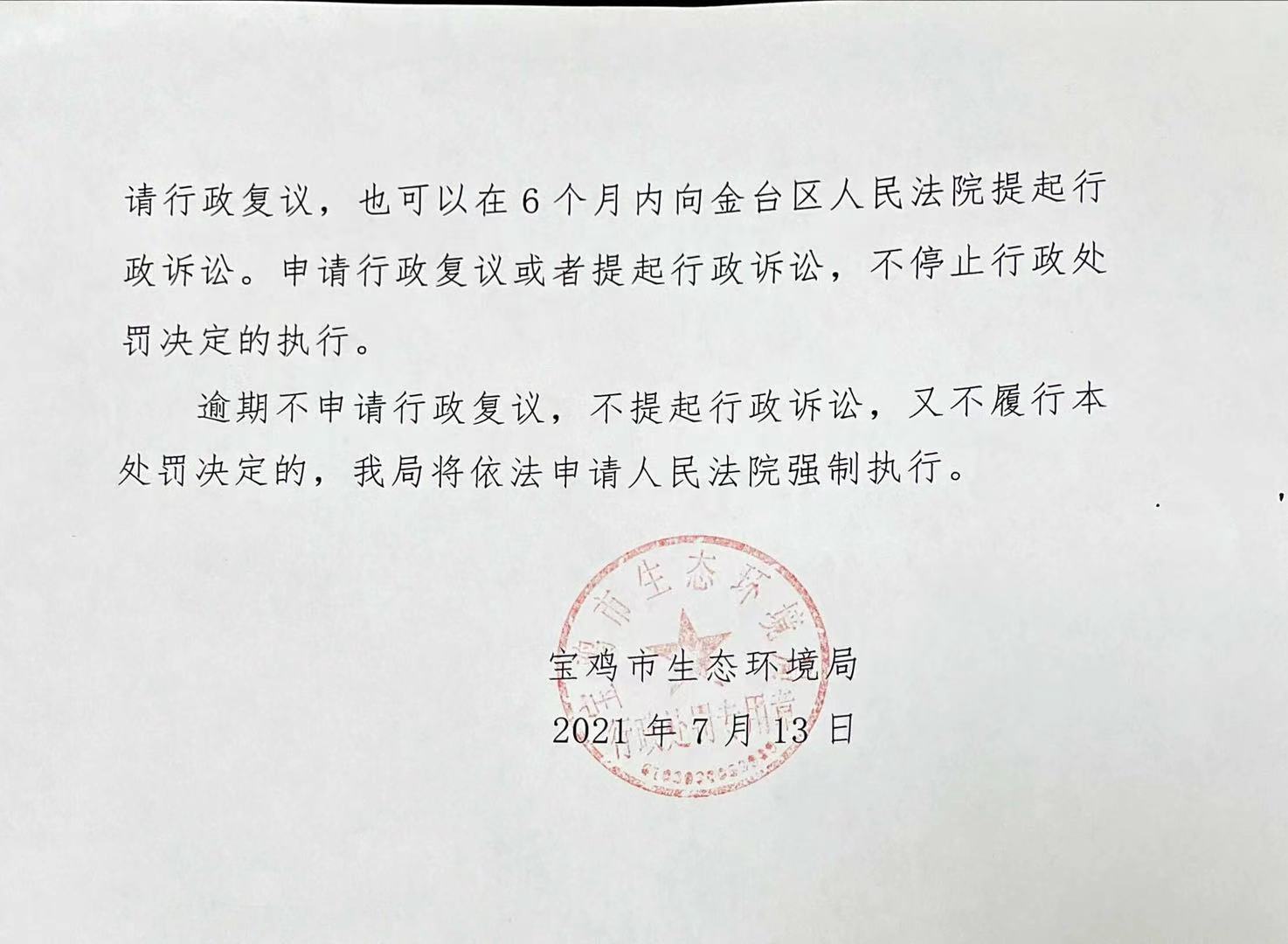 十大网赌平台排行榜 行政处罚决定书(存根) 陕C陈仓环罚〔 2021 〕20号