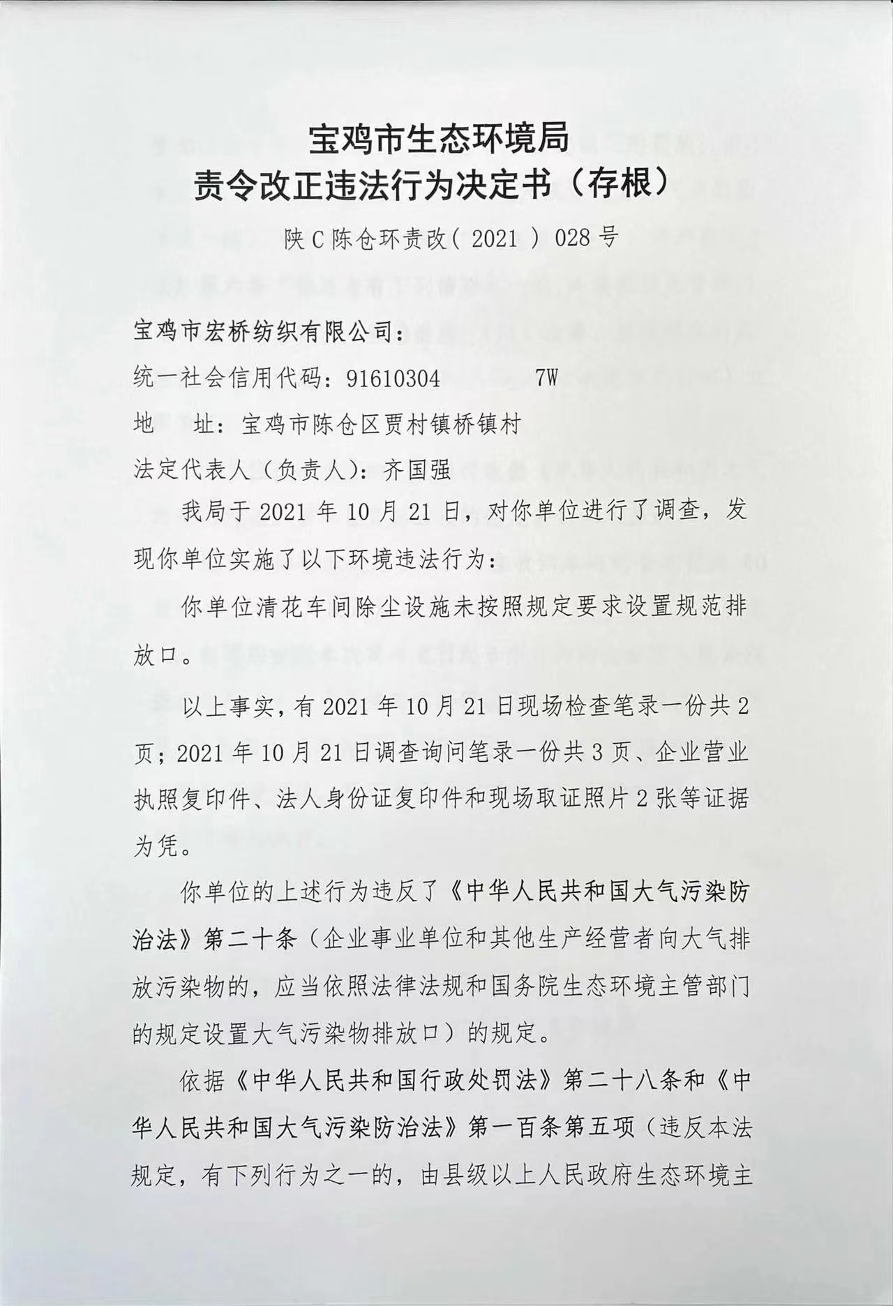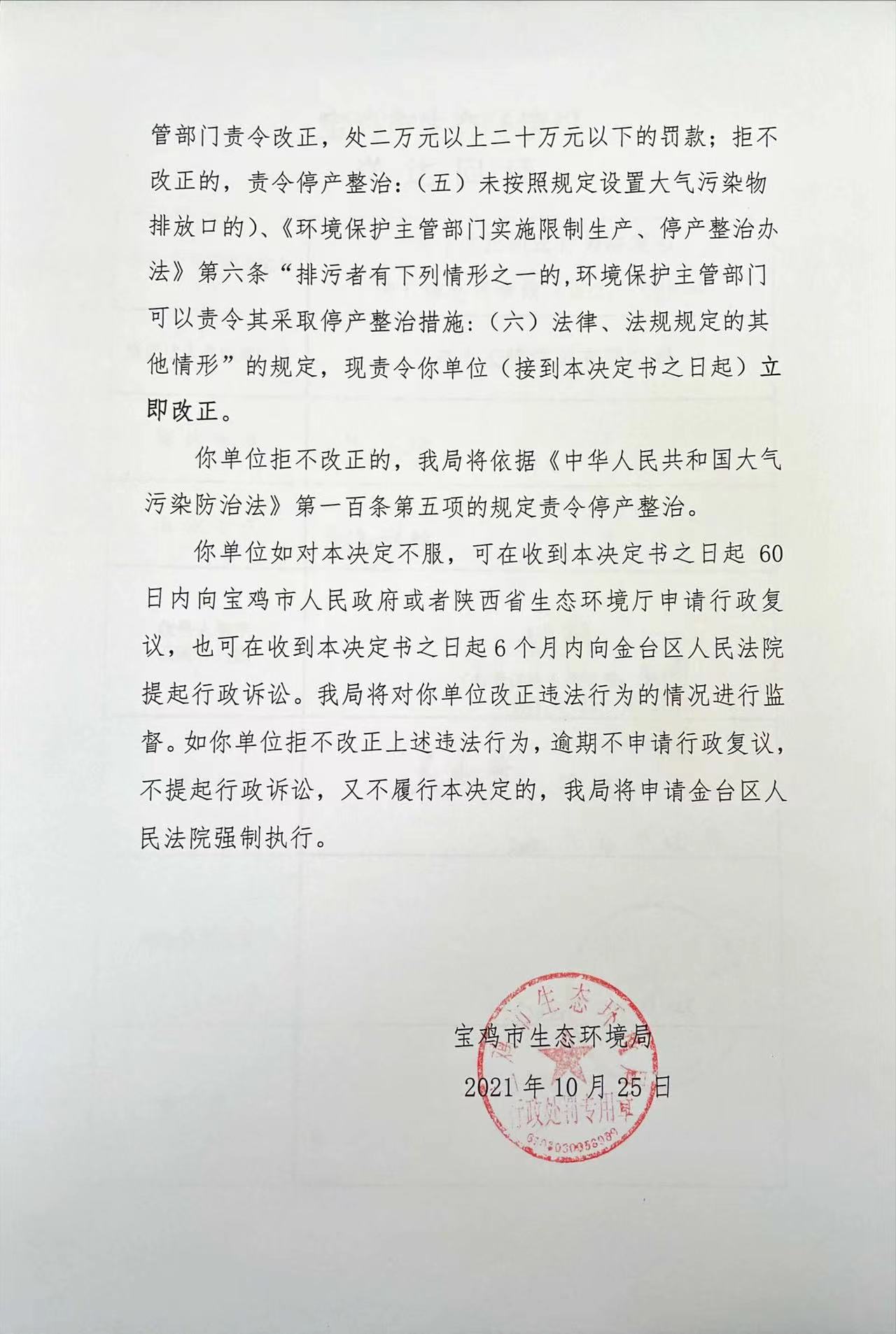 网赌平台 责令改正违法行为决定书(存根) 陕C陈仓环责改( 2021 ) 28号