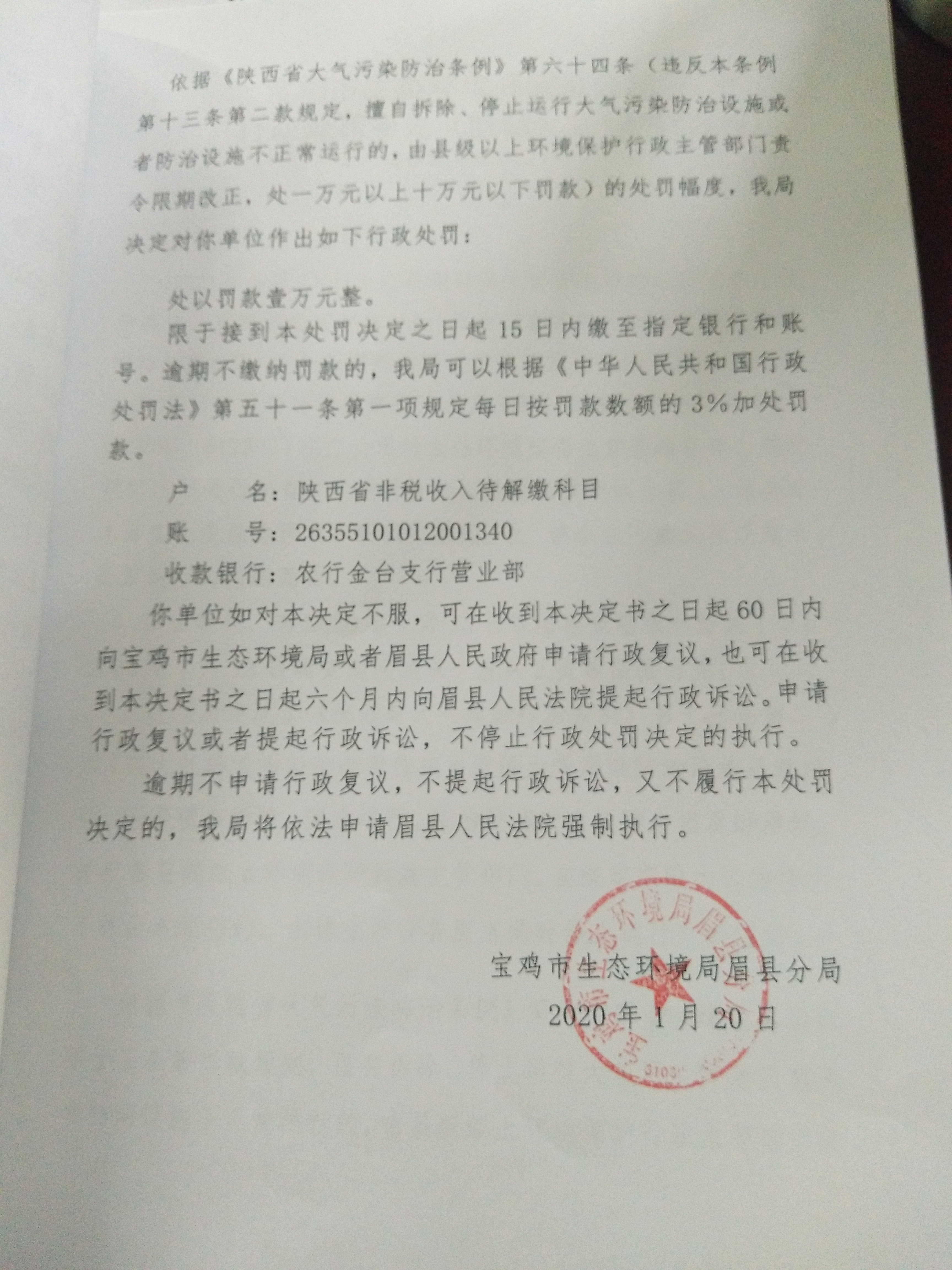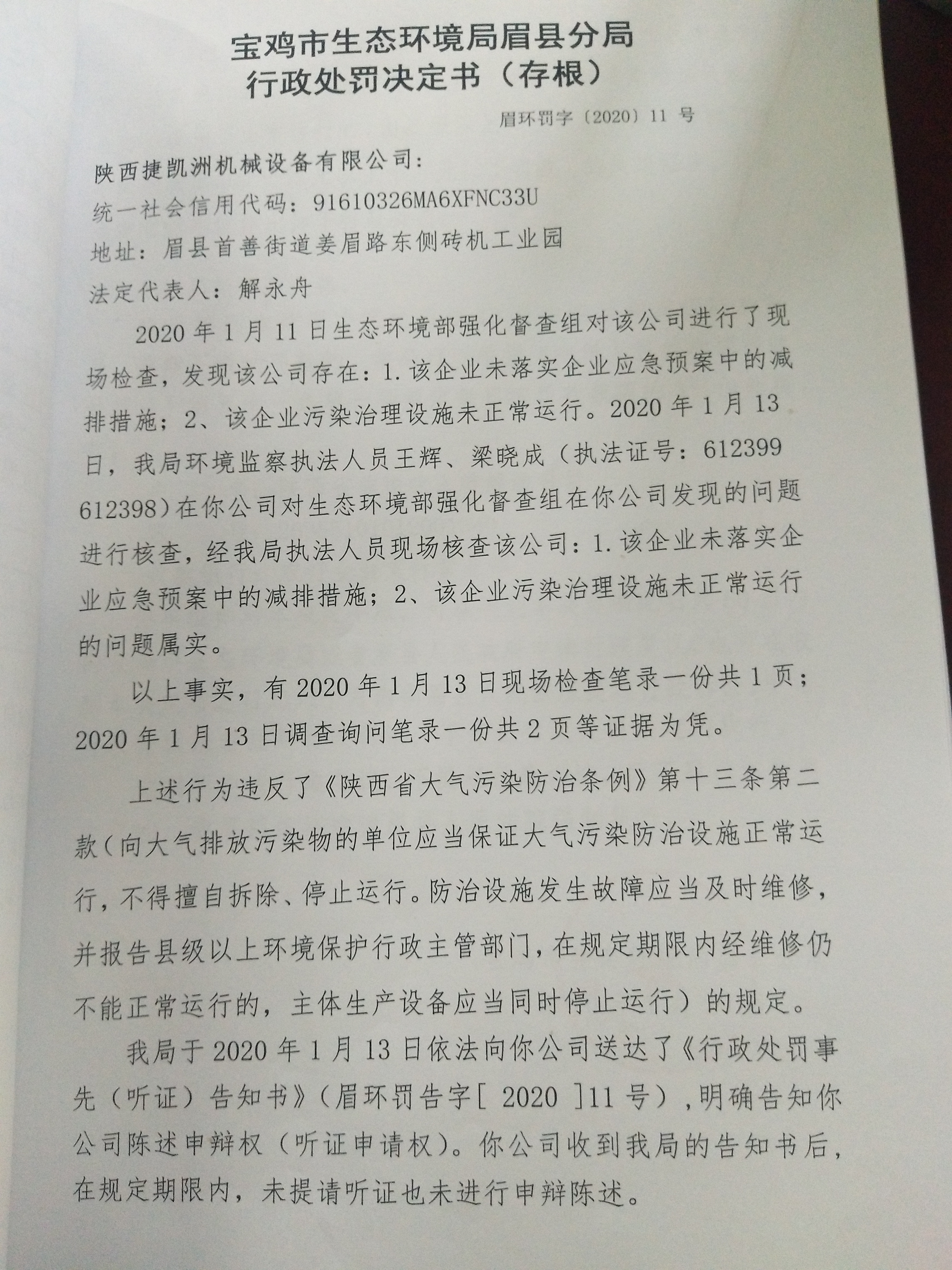 十大网赌平台排行榜眉县分局行政处罚决定书 眉环罚字(2020)11号