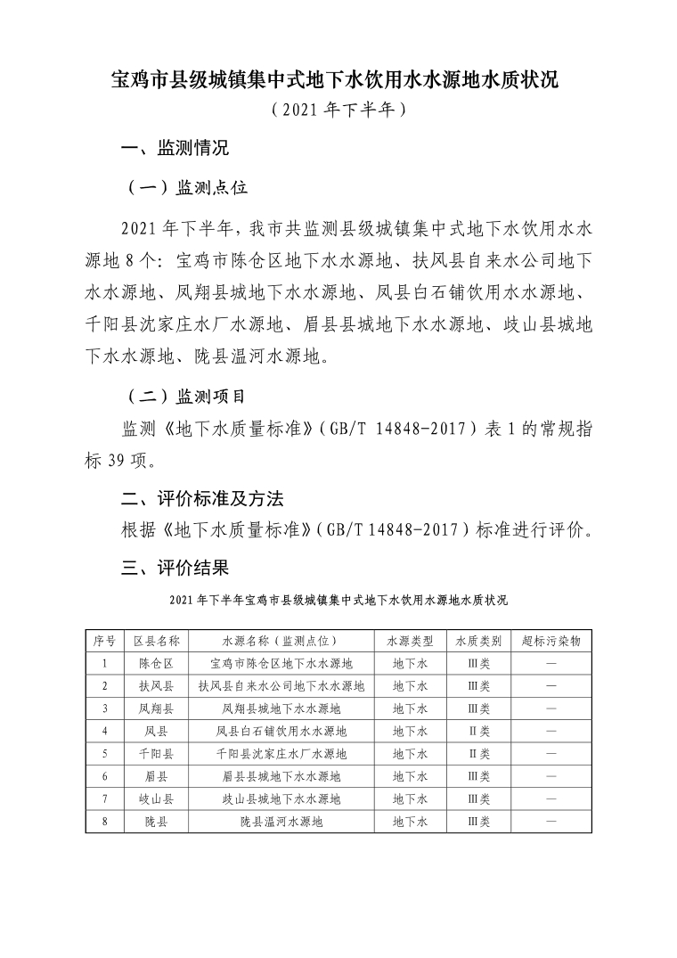 网赌平台县级城镇集中式地下水饮用水水源地水质状况(2021年下半年)